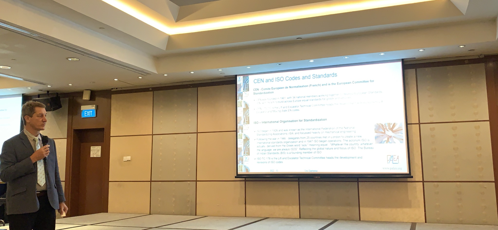 Hội thảo mở đầu là bài phát biểu về việc phát triển Tiêu chuẩn ISO 8100 của Eric Darmenia, Cố vấn cấp cao Tập đoàn Jardine Schindler ở Australia. Đó là những phân tích về hoạt động mà ISO và Ủy ban Tiêu chuẩn Châu Âu (CEN) đã thực hiện, với sự hợp tác của các cơ quan quản lý quốc gia để phát triển một bộ luật thang máy quốc tế mới hài hòa giữa yêu cầu an toàn thang máy trên toàn thế giới và hỗ trợ Thương mại Không rào cản kỹ thuật toàn cầu (Global Trade Barrier Free Technology – GTBFT)