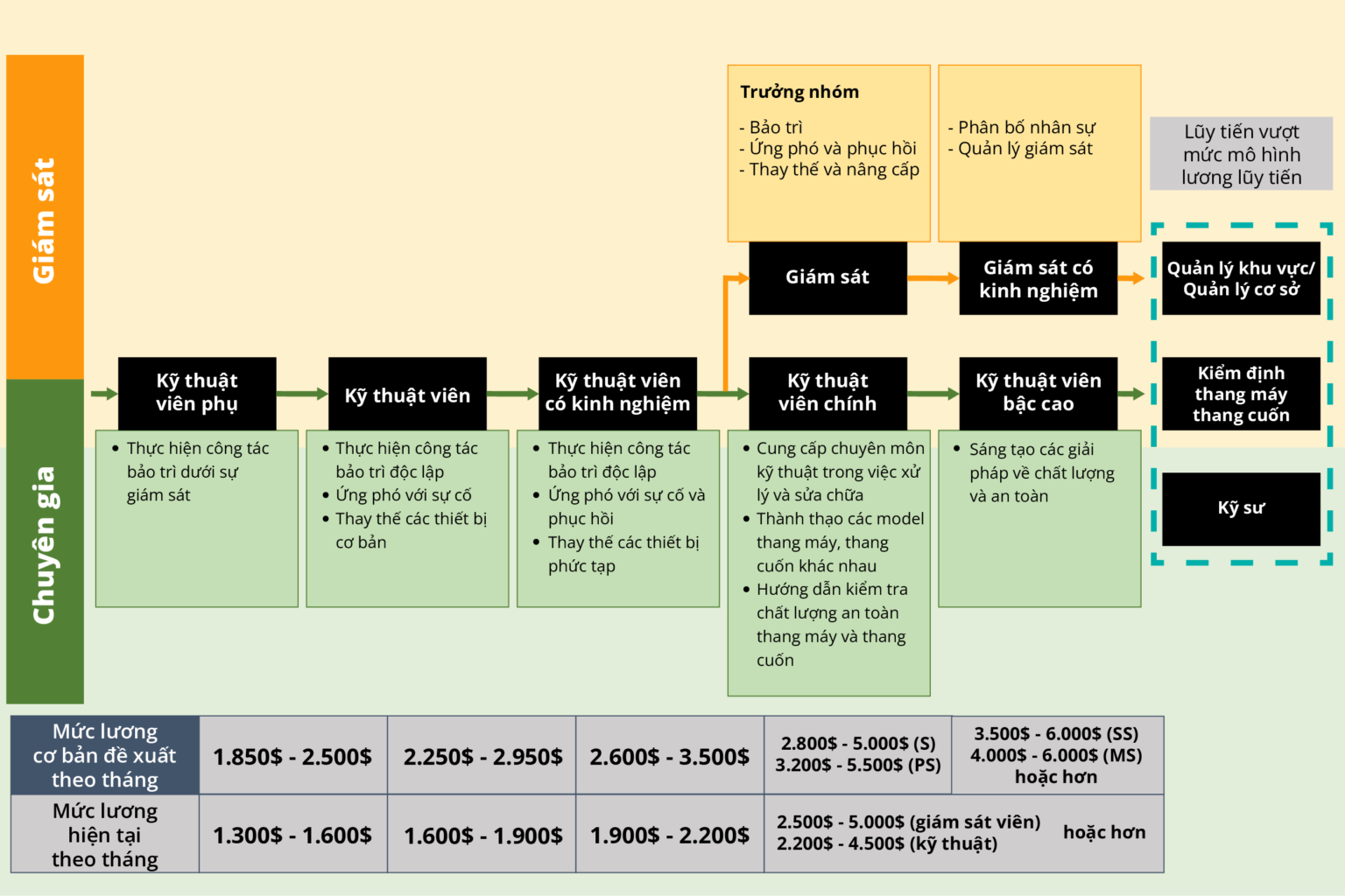 Lộ trình phát triển hiện có trong ngành thang máy, dựa trên khảo sát từ các công ty thang máy được thể hiện trong Sơ đồ 1. Công nhân sẽ bắt đầu ở cấp độ Thợ cơ khí và tích lũy một số kiến thức trước khi chuyển sang cấp độ Kỹ thuật viên. Những kỹ thuật viên có kỹ năng tốt hơn sẽ phát triển lên vai trò Giám sát... Với lộ trình thông thường như vậy sẽ tạo ra tình trạng thiếu các kỹ thuật viên lành nghề và giàu kinh nghiệm, làm việc trực tiếp.